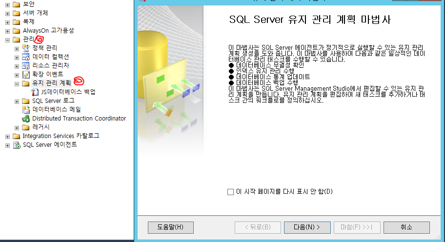 서버에 접속후 관리>유지 관리 계획>마우스 우클릭하시고. SQL Server 유지 관리 계획 마법사를 선택합니다.