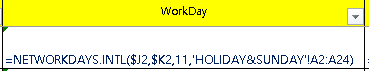 M. Workday (= 작업일) - =NETWORKDAYS.INTL($J2,$K2,11,'HOLIDAY&SUNDAY'!A2:A24)