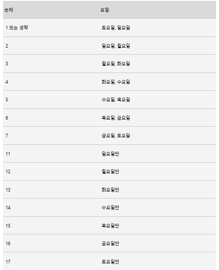 예를 들어 0000011은 토요일과 일요일이 주말임을 나타냅니다