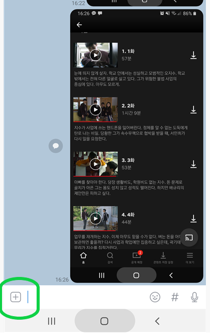 그럼, 카카오톡에서 이미지 화질선택 설정 순서입니다. 아래 초록색 표시한 [+]를 눌러줍니다.