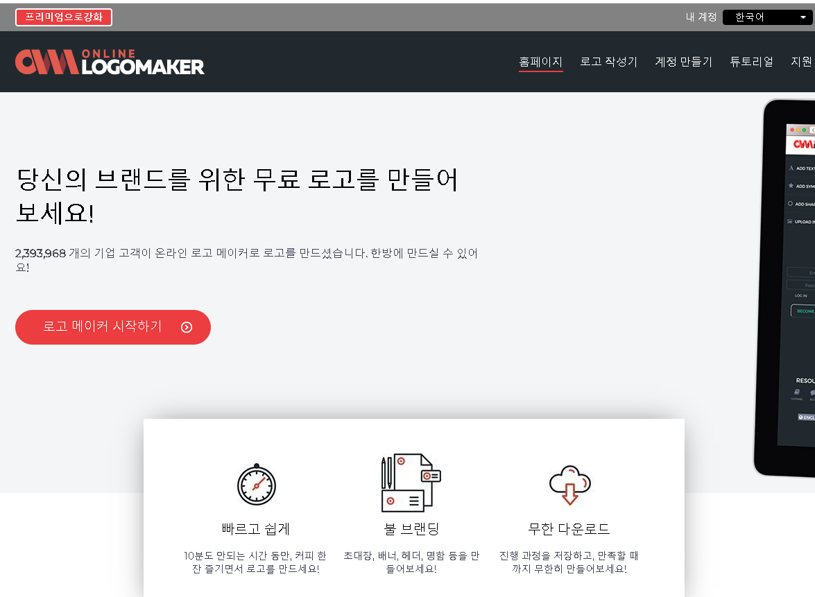 로고 메이커 시작하기를 눌러줍니다. 물론 프리미엄으로 강화할수도 있네요....