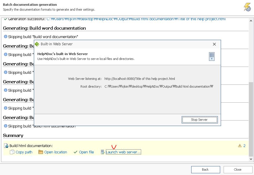 - html 제레레이트하면 lunch web server 를 클릭해서 로컬 서버에서 메뉴얼이 실행됩니다.