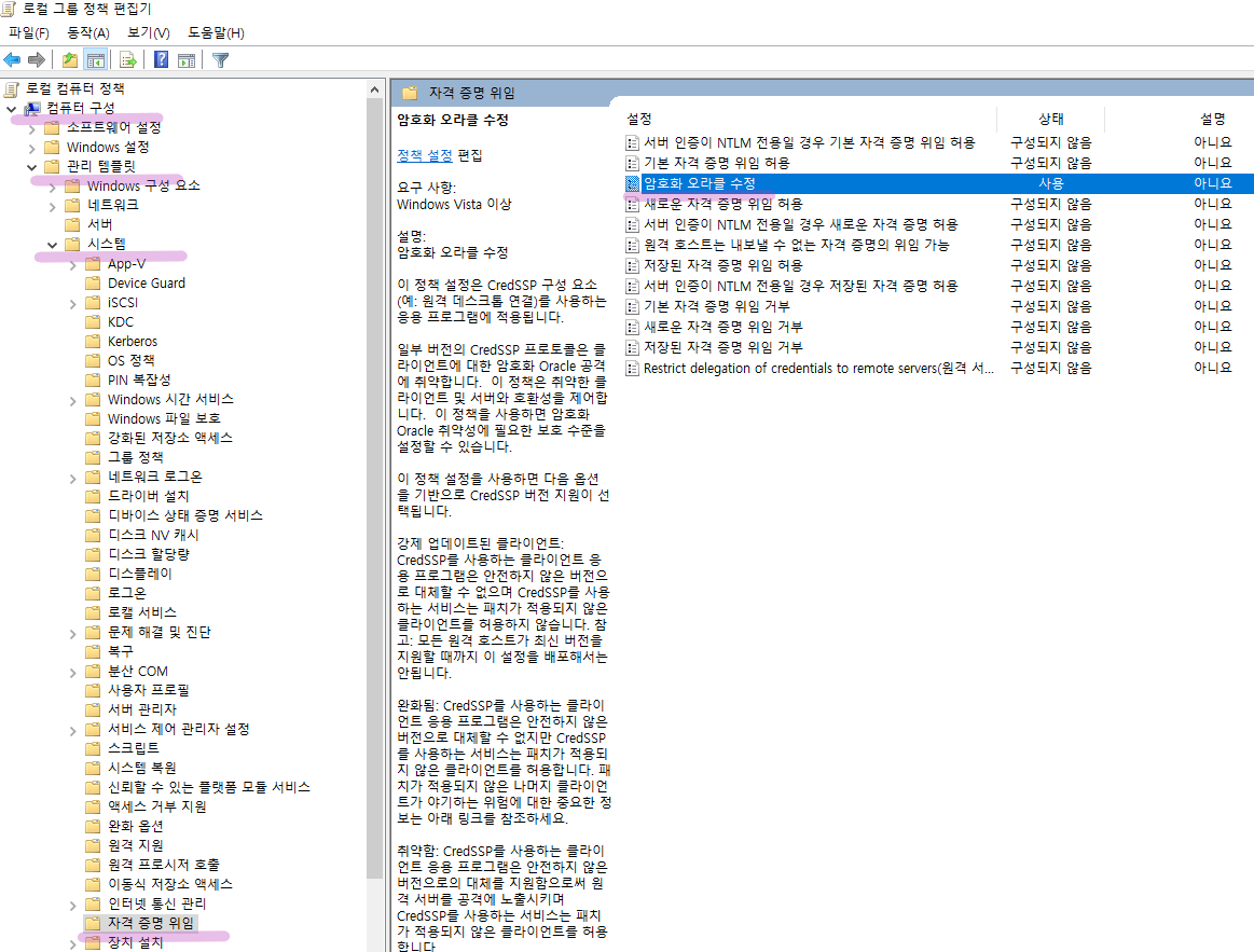 5. 컴퓨터 구성 -> 관리 템플릿 -> 시스템 -> 자격 증명 위임 -> Oracle 수정 암호화