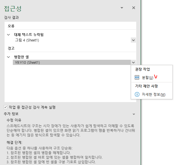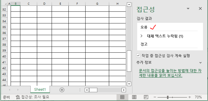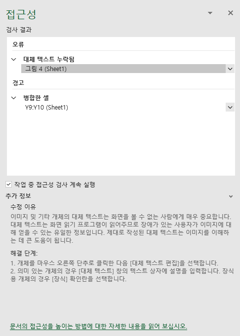 엑셀 아래쪽에 sheet 명이 있는 곳에 보면 접근성: 조사필요 를 클릭해보면..
