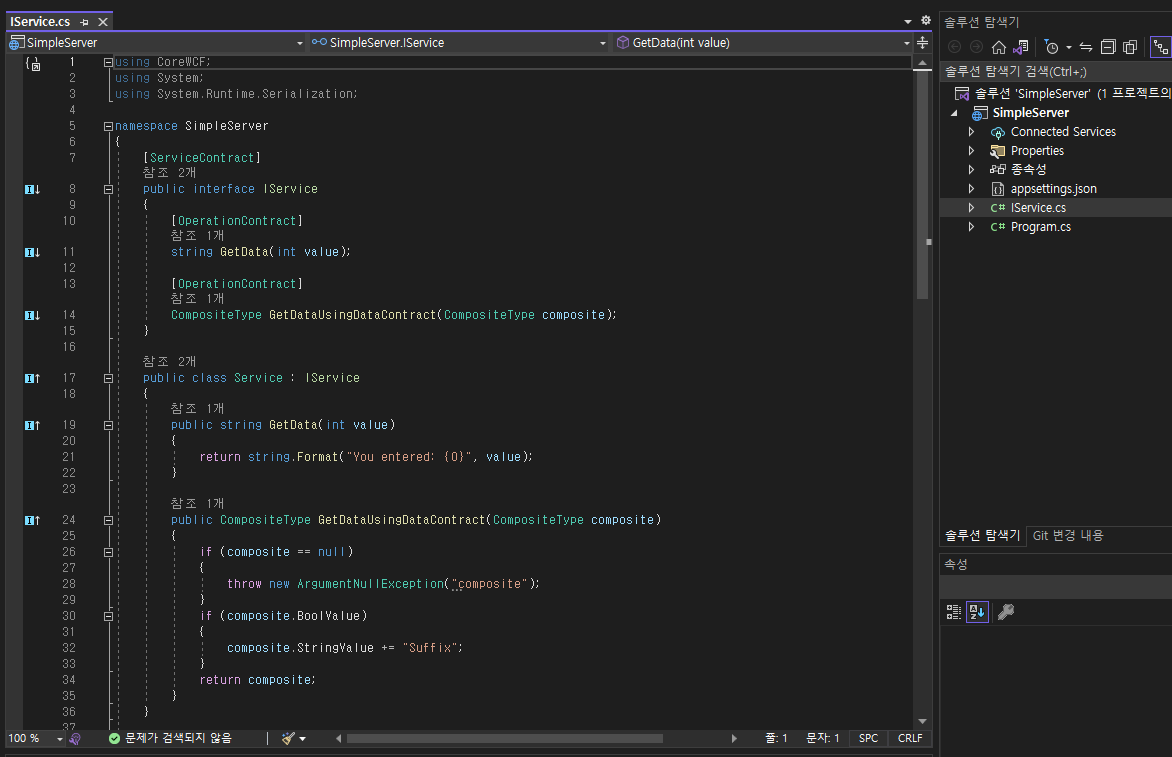 하면 비쥬얼스투디오가 실행되면서 IService.cs 를 볼 수 있습니다.