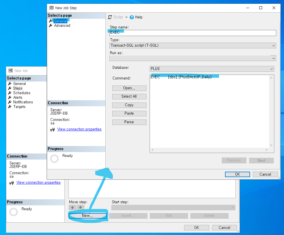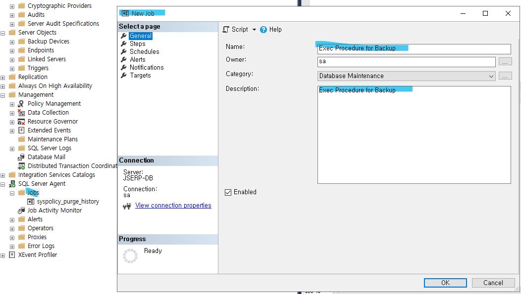 2. 잡 스케줄에 프로시저 실행 문을 등록한다.